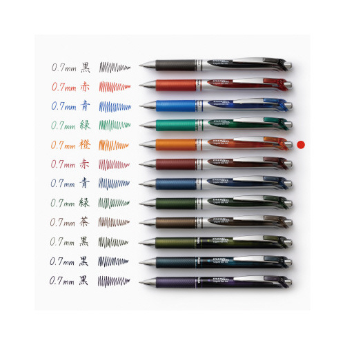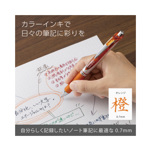 濃く、はっきり書け、速記にも強く乾きも早い。エナージェル専用リフィル。●ボール径/0.7mm●インク色/オレンジ●インク種類/水性染料インク●種別/ノック式エナージェル●替芯種別/XLR7●単位/1本
