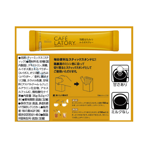 やさしいはちみつの甘みと香りのノンカフェインのルイボスティー●種別/芳醇はちみつルイボスティー●カロリー/1杯分あたり20kcal●必要湯量/スティック1本に対して150ml●容量/7本●単位/1箱(7本入)
