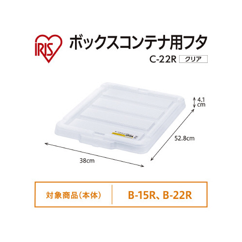収納用品として暮らしのさまざまな場面で多目的に活用できるBOXコンテナ12.8L・20.9L専用のフタです。●外寸法/約幅528×奥行380×高さ41mm●質量/約412g●材質/ポリプロピレン●カラー/クリア●適合コンテナ/B-15、B-22、B-15R、B-22R●単位/1個
