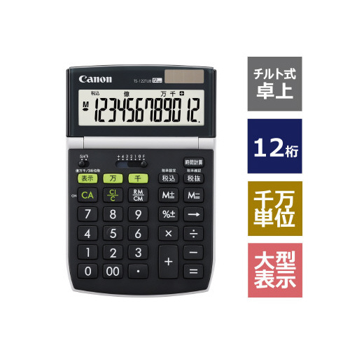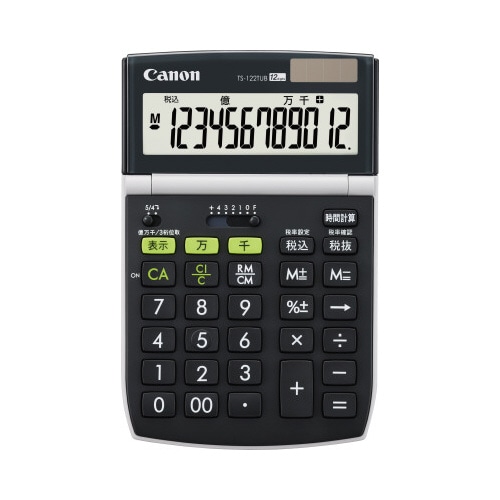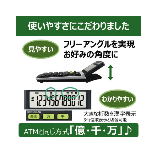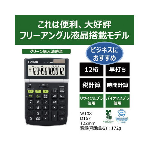 バイオマスプラを採用したグリーン購入法適合の電卓。便利なフリーアングル・チルト液晶モデル。●質量/172g(電池含む)●サイズ/108×167×22(幅×奥行×厚さ)mm●桁数/12桁●電源/太陽電池+リチウム電池(CR2032×1)●機能/税計算、千万単位キーつき、時間計算、フリーアングルチルト液晶●保証期間/1年●チルト/あり●メモリー/あり●四捨五入/あり●演算状態表示/あり●単位/1台