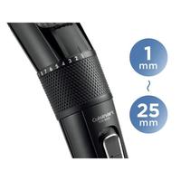 仕上がりの長さは調節ダイヤルを回すことで1-25mmまで設定可能(1mm単位で調節)●カラー/ブラック●本体サイズ/(幅)4.7×(奥行)4.9×(高さ)19.5cm●本体重量/175g●電源/AC100-240V 50/60Hz●機能/コーム長さ設定:1-25mm、アタッチメント:ヘア用コーム/ヒゲ用コーム、水洗い:刃のみ可能、電源方式:充電/交流式(専用ACアダプター使用)、充電時間:約8時間、コードレス使用時間:約60分●付属品/ACアダプター、ヘア用コーム、ヒゲ用コーム、掃除用ブラシ、オイル、ポーチ●単位/1台