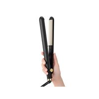 髪に密着しやすく優しく挟めるクッションプレート●カラー/ブラック●本体サイズ/(幅)32.7×(奥行)3×(高さ)3.8cm●本体重量/360g●電源/AC100-240V 50/60Hz●消費電力/45W●コードの長さ/約1.7m●機能/マイナスイオン、プレート:セラミックコーティング、プレート最高温度:約200℃、温度調節機能:5段階(約120/140/160/180/200℃)、自動電源OFF機能:約60分、プレートサイズ:幅25×長さ120mm●単位/1台