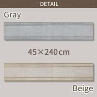 ナチュラルな風合いが楽しめる。環境に優しいサステナブルなリサイクル繊維使用。やわらか素材なので、たたみやすく、洗濯がしやすい。裏面は滑りにくい加工済。●カラー/グレー●寸法/ 45×240cm●材質/ポリエステル, コットン●入数/1個●単位/1個