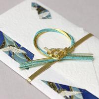 青色に鶴柄の模様で彩った千代紙が全体に調和した、洗練されたデザインの金封です。●寸法/縦185mm横105mm●単位/1セット(5枚入)