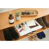テーブルなどの天板の下に引き出しが簡単に取り付けられます。天板にピタッ!と取り付けるだけ。取り付け方法:両面粘着テープ・ネジ。ロック機能付。デスク、下駄箱、収納棚、ワゴンの天板などにも。●カラー/ホワイト●商品サイズ/本体:幅174×奥行292×高さ40mm、引き出し内寸:幅125×奥行230×高さ25mm●商品重量/388g●材質/本体 取手部 ロック部 ABS樹脂 引き出し ポリプロピレン 両面粘着テープ・基材 アクリフォーム 接着剤 アクリル系 ネジ スチール(ユニクロメッキ) バネ SW-B ●耐荷重/約1kg●生産国/日本●単位/1個