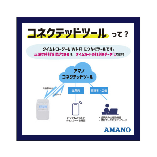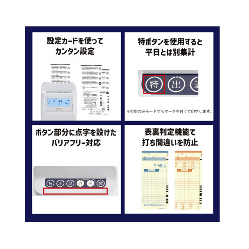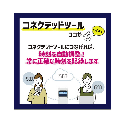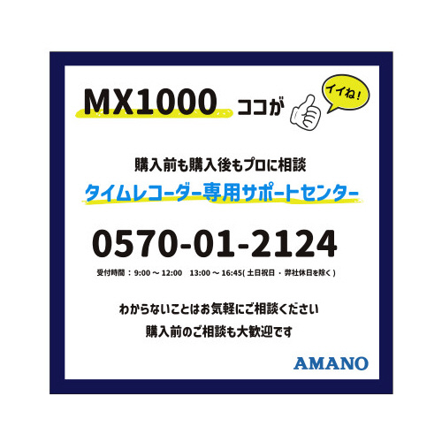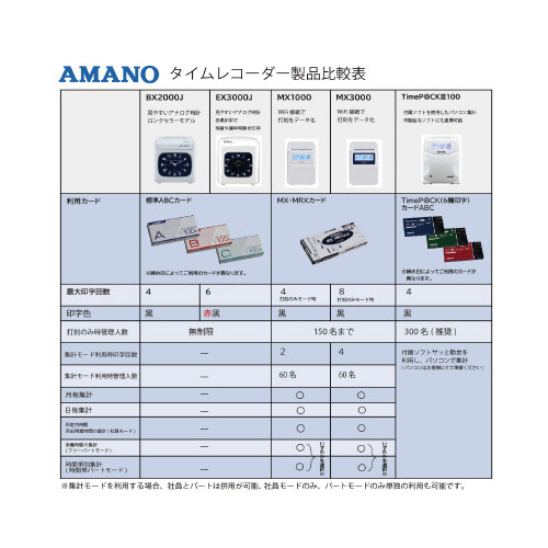 初めて導入する方も安心。本体とカードがセットになっているので、届いたその日から使用できます。1日最大4回記録または2回記録の時間集計が可能。クラウドサービスとつないで、打刻をCSV出力可能。●セット品/MX-10001台、MX・MRXカード1箱●質量/1.1kg●寸法/幅156×奥行100×高さ23mm●使用人数/計算時60名、印字のみ時150名●付属品/インクリボンCE-320050装着済●対応カード/MX・MRXカード●保証期間/1年●電源/AC100V50/60Hz●印字方式/ドットプリンタ方式●計算項目(日計)/(1)社員モード利用時:時間外時間数(早出・残業・深夜残業帯時間数の合計)(2)時間帯パートモード利用時:実働時間数(3)フリーパートモード利用時:実働時間数。●消費電力(50・60Hz)/動作時1.7A(16W)、待機時0.1A(1W)●仕様/電波時計搭載・クラウドサービス「アマノコネクテッドツール」と接続可能●印字/2回打刻+日毎集計、日毎累計、月毎集計。印字のみの場合、4回打刻●単位/1台