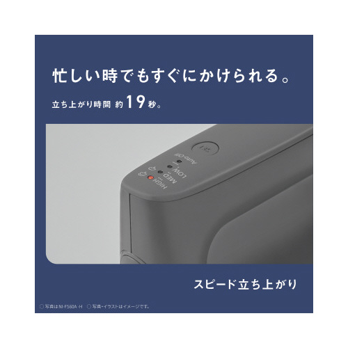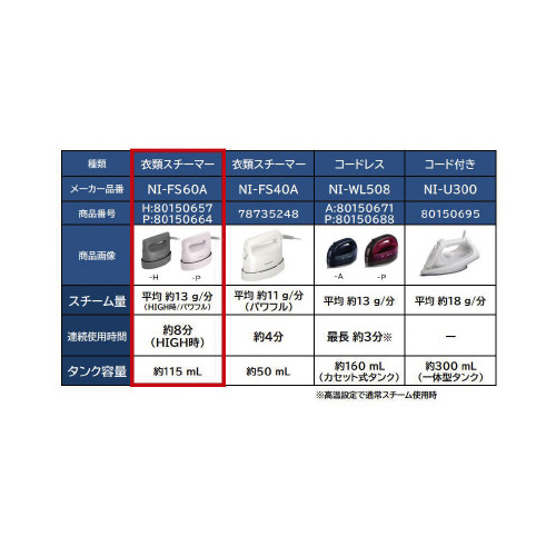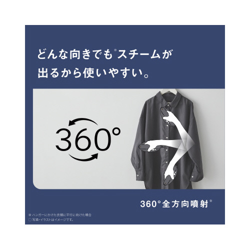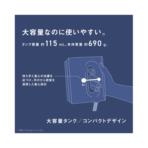 時短で衣類のシワ・ニオイとり。温度調節機能を新搭載したハイスタンダードモデル。●カラー/カームグレー●注水量/約115mL●電源コード長さ/約2.5m●本体寸法/約幅8×高さ13×長さ16.5cm●収納時寸法※スタンド含む/約幅9×高さ15.5×長さ17.5cm●本体質量/約690g(スタンド含まず)●収納時質量※スタンド含む/約775g(スタンド:85g込み)●ベース種類/フラットベース●スチーム穴の数/6穴●温度/HIGH:約160℃,MED:約140℃,LOW:約110℃●立ち上がり時間/約19秒●スチーム/浸透スチーム360°全方向噴射●スチーム噴出し時間/連続約8分●スチーム量/平均約13g/分●単位/1台