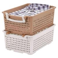積み重ねできる機能バスケット。取っ手を内側にすれば積み重ねOK。子供部屋のおもちゃなどの整理や、ワイシャツ・ジーンズ・セーターなど衣類の整理に。Yシャツなら約4枚収納。●カラー/アイボリー●商品サイズ/幅250×奥行385×高さ140mm●商品重量/414g●材質/本体 ポリプロピレン 取手 ポリスチレン●生産国/日本●単位/1セット(4個入)