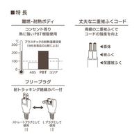・難燃・耐熱ボディ:コンセント周りに熱に強いPBT樹脂使用・丈夫な二重被ふくコード:二重被ふくでコードの強度を向上・フリープラグ:ストレートプラグ&Lプラグ両用、耐トラッキング絶縁カバー付●コンセント/1個口●プラグ形状/フリープラグ●AC出力/1500W以下●コード長/0.5m●単位/1個