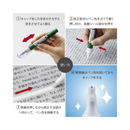 ※ご使用の前にキャップをしたままカチカチと音をさせてよく振ってください。※修正・筆記以外には使用しないでください。