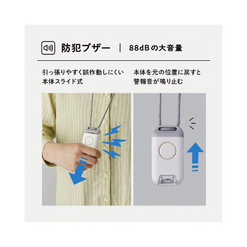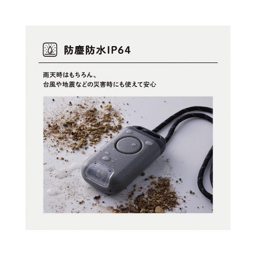 ※本製品は大音量で相手を威嚇または周囲の人に危険を知らせることを目的とするもので、犯罪防止を保証するものではありません。※万一の盗難、事故、トラブルなどによる損害について、当社では責任を負いかねますのであらかじめご了承ください。※使用前には必ず警報音が鳴ることを確かめてください。最低1ヶ月に1回程度は、警報音が鳴るかどうか確かめ、警報音が小さくなったりした時は、新しい電池に交換してください。※雨天時などで携帯しても内部に水の侵入はありませんが、警報音を鳴らした場合は内部に水が侵入し、音量が低下する場合があります。※ネックストラップを首や手など身体に巻き付けないでください。※本製品は日本国内専用です。