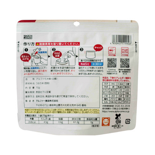 熱湯5分、水の場合 30 分でできあがるクイックタイプのアルファ化米です。特定原材料等(アレルギー物質)28品目不使用の食物アレルギーに配慮した長期保存食。●種別/防災備蓄食●カロリー/268kcal●付属品/スプーン●賞味期限/商品発送の時点で、賞味期限まで残り1460日以上の商品をお届けします。●商品寸法/横160×高さ150×マチ幅84ミリ●内容量/70g●最大出来上がり量/220g●原材料名/うるち米(国産)●添加物/無し●調理方法/熱湯を注いで5分、または水を注いで30分で食べることができます●ケースサイズ/縦305×横290×高さ240ミリ●単位/1ケース(20入)