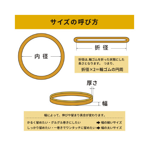 ※内容量の本数は、平均値から求めた参考値となります。※推奨結束範囲は、1重巻きを想定した場合の結束したい物の外周参考値となります。<保管・使用上の注意>天然ゴムを使用しています。紫外線や熱を長期間かかる場所でご使用されると輪ゴムが切れる場合がございます。直射日光および高温多湿な場所をさけて保管してください。