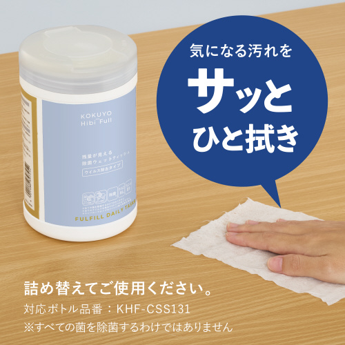 シートの残量が見える半透明キャップ採用で、詰め替え目安がわかるウィルス除去成分配合の除菌ウェットティッシュの詰め替え用。施設のドアノブや手すりの清掃に。●シート寸法/123×180mm●材質/シート:不織布●種別/詰め替え用●枚数/110枚●種類/ウィルス除去タイプ●パッケージ寸法/90×70×185mm●主成分/水、エタノール、メチルパラペン、プロピルパラベン、PEG-30水添ヒマシ油、ポリアミノプロピルビグアニド、EDTA-2Na、ジメチコン●M品番/KHF-CSR131●単位/1個(110枚入)