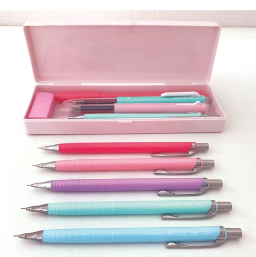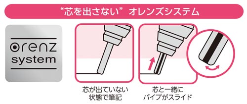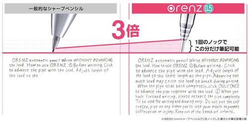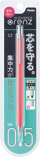 芯が折れないシャープペンオレンズ。スタンダードな芯径0.5mmタイプ。ノック1回の筆記量は一般的なシャープペンシルの約3倍(※メーカー調べ)。●芯径/0.5mm●軸色/チェリーレッド●ペン先/ペン先収納タイプ●付属品/消しゴム付き●機構/芯が減るのに合わせて先端パイプがスライドするオレンズシステム搭載●材質/軸:再生PC●仕様/スタンダード●寸法/(最大軸径・長さ)Φ9×149mm●単位/1セット(5本入)