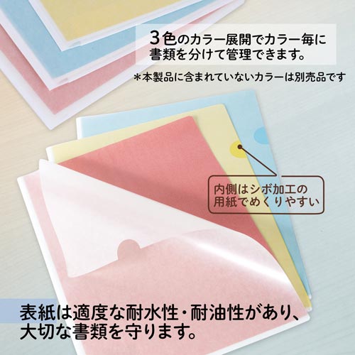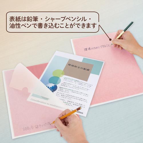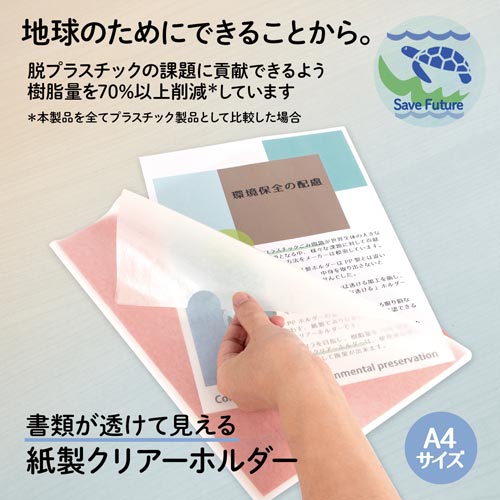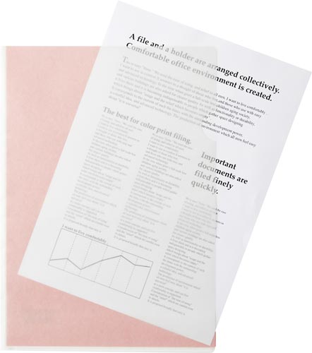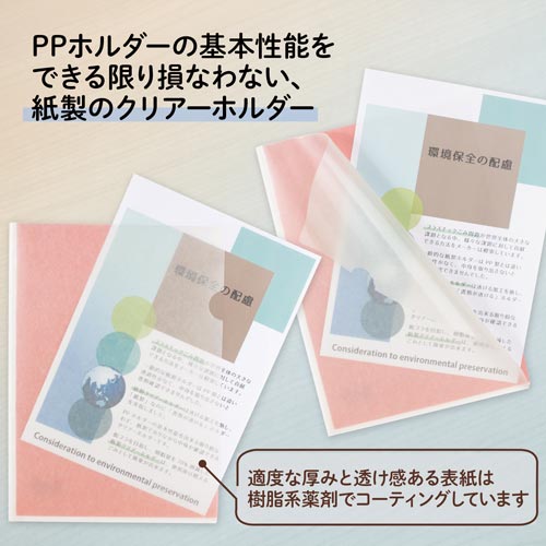 書類が透けて見える紙製クリアーホルダー。樹脂量を70%削減。●サイズ/W220×H310mm●カラー/ピンク●材質/表:紙(一部樹脂使用)、裏:紙●単位/1セット(10枚入)