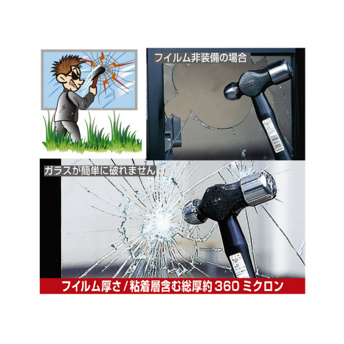 ※熱線反射ガラス、熱線吸収ガラス、線入りガラス、二重ガラス、有機ガラスなどの特殊ガラスに施工されても使用には問題ないと考えますが、直射日光等が当たりガラスの温度が高くなる場所においては「一部機能性フィルム(当フィルムではありません)を施工されると稀に割れると言う事案が発生しているのも事実です。当社防犯フィルムの施工でガラスが自然環境によって割れる事は無いと考えますが、万一ガラスが割れましても当社は一切補償は出来ませんので、施工についてはご自身の責任において実施されますようお願い申し上げます。