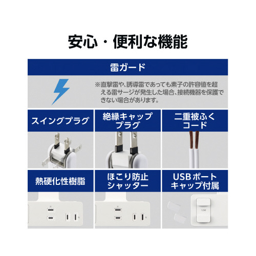 ※※USB端子形状/USB-Aポート×2※AC側定格/14A、125V、合計1400Wまで※USB側定格入力/AC100V-240V、50/60Hz、0.5AMAX※USB側定格出力(1ポート使用時)/12W(5V/2.4A)※【返品に関するご注意】開封後はお客様のご都合による返品はお受けできません。