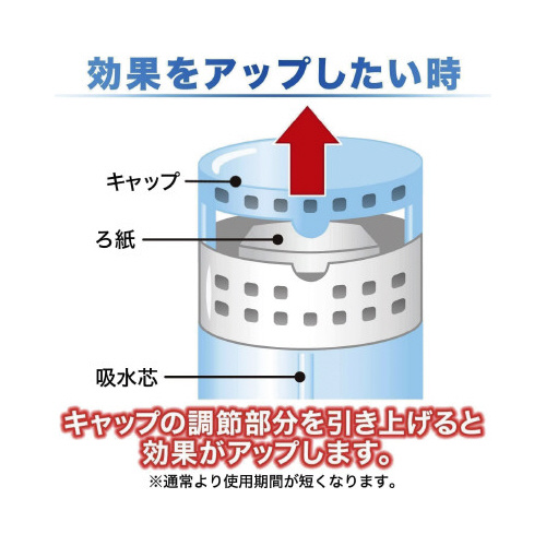 ※※本品は飲めない。※幼児の手の届くところに置かない。※安定した場所に置く。※液体がしみ出るので倒さない。液体が付着すると塗装面や床がシミになったり、変色の恐れがあるのですぐに拭き取る。※高温になるところや直射日光の当たるところには置かない。※用途以外に使用しない。※容器の構造上、ボトルの底部に液体が多少残ります。液体が吸水芯の下まできたら、お取り替えください。※保管中や使用中に液体やろ紙が変色することがありますが、性能上問題ありません。誤飲に注意【応急処置】液が目に入った場合は充分流水で洗う。皮フについた場合は石けんでよく洗う。異常のある時は医師に相談する。