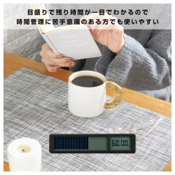 残り時間が一目で分かるタイマーに黒モデル登場!目盛りで残り時間が一目で分かるタイマー。作業時間と休憩時間を交互に繰り返せるリピート計測モードで勉強や運動の時間管理「ポモドーロ・テクニック」等に。●カラー/黒●質量/約56g(乾電池を含まず)●仕様/表示方法:液晶デジタル、タイマー桁数:4桁、目盛り個数:20個、タイマー:通常計測、カウントダウン:最大計測時間99分50秒●外形寸法/約132(W)×21(D)×29(H)mm●主な材質/ABS●仕様2/カウントアップ:最大計測時間99分59秒、リピート計測カウントダウン:最大99分50秒、リピート数:作業時間最大99回、休憩時間最大98回、アラーム:消音切替え可能●電源/単4形アルカリ乾電池×2本(電池別売)●単位/1セット(3個入り)