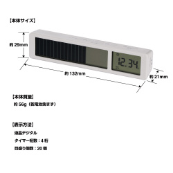 作業時間と休憩時間を交互に繰り返せるリピート計測モードで勉強や運動の時間管理「ポモドーロ・テクニック」等に。●カラー/白●質量/約56g(乾電池を含まず)●仕様/表示方法:液晶デジタル、タイマー桁数:4桁、目盛り個数:20個、タイマー:通常計測、カウントダウン:最大計測時間99分50秒●外形寸法/約132(W)×21(D)×29(H)mm●主な材質/ABS●仕様2/ カウントアップ:最大計測時間99分59秒、リピート計測カウントダウン:最大99分50秒、リピート数:作業時間最大99回、休憩時間最大98回、アラーム:消音切替え可能●電源/単4形アルカリ乾電池×2本(電池別売)●単位/1セット(3個入り)