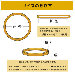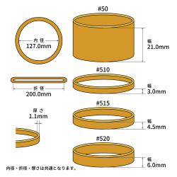 全サイズから探す場合は、「オーバンド 透明袋」(50g/500g)よりお選びください。●種別:NO.520/●カラー:アメ色/●容量:1kg(約390本)/●材質:天然ゴム/●切幅:6mm/●厚み:1.1mm/●折径(内径):200mm(127mm)/●推奨結束範囲:800から880mm/●単位/1袋(約390本入)