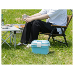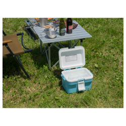 超小型クーラーボックスです。(5L)お弁当の保冷にピッタリ。収納目安は350ml缶なら6本、500mlペットボトルなら4本(横置き)収納可能です。●材質/本体・ふた;ポリプロピレン、パッキン:発泡ポリスチレン、断熱材:発泡スチロール●カラー/セラドンブルー●外寸法(約)/幅290×奥行219×高さ204mm(ベルト穴の突出した部分含む)●内寸法(約)/幅217×奥行147×高さ161mm●重量/0.9kg●許容内容量/5L●単位/1個