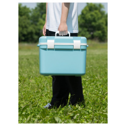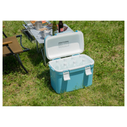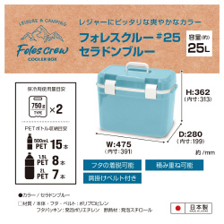 2Lペットボトルが立てて収納できる中型クーラーボックスです。(25L)500mlペットボトルなら15本、2Lペットボトルなら7本収納可能です。●材質/本体・ふた・ベルト;ポリプロピレン、パッキン:発泡ポリスチレン、断熱材:発泡スチロール●カラー/セラドンブルー●外寸法(約)/幅475×奥行280×高さ362mm(ベルト穴の突出した部分含む)●内寸法(約)/幅391×奥行199×高さ313mm●重量/2kg●許容内容量/25L●付属品/肩掛けベルト×1●単位/1個
