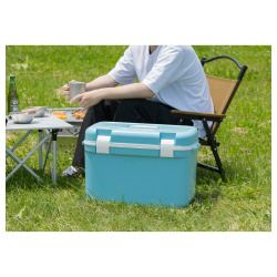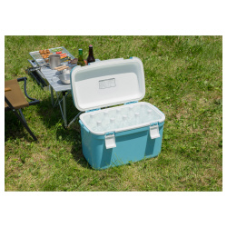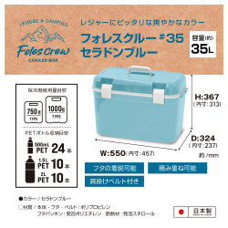 2Lペットボトルが立てて収納できる大型クーラーボックスです。(35L)500mlペットボトルなら24本、2Lペットボトルなら10本収納可能です。●材質/本体・ふた・ベルト;ポリプロピレン、パッキン:発泡ポリスチレン、断熱材:発泡スチロール●カラー/セラドンブルー●外寸法(約)/幅550×奥行324×高さ367mm(ベルト穴の突出した部分含む)●内寸法(約)/幅457×奥行237×高さ313mm●重量/2.8kg●許容内容量/35L●付属品/肩掛けベルト×1●単位/1個