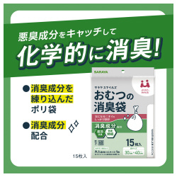 気になるニオイをしっかり消臭!消臭成分を練りこんだポリ袋。排せつ臭や生ゴミ臭に特有の悪臭成分を化学的に取り除きます。大人・赤ちゃん用の使用済みおむつや、生ゴミ・ペットの排泄物処理にも。●種別/15枚入●サイズ/ヨコ30cm×タテ40cm●外寸法/幅150・奥行8・高さ210mm●容量/15枚入●カラー/半透明(白っぽい色)●材質/ポリエチレン●質量/62g●仕様/消臭成分を練りこんだ消臭袋。●機能/悪臭成分をキャッチして化学的に消臭。●単位/1パック(15枚入)