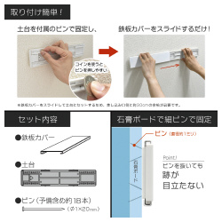 「浮かせる収納」の場所を作れる商品です。工具は不要で、石膏ボード壁面に取り付けが可能。壁に設置した場合の目安耐荷重「約10kg」となります。●サイズ/W254×H58mm●カラー/木目●厚さ/9mm●材質/本体:鉄板、土台部:ABS、ピン:ステンレス●耐荷重/壁に設置時:約10kg、天井に設置時:約5kg(注意事項をご一読ください)●単位/1セット(5個入り)