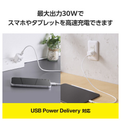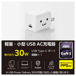 コンパクトなのにパワフル。対応するスマートフォンはもちろん、Macbook Airも充電できるAC充電器です。●寸法/幅約35.5mm×奥行約28.5mm×高さ約28.5mm●質量/約49g●材質/-●入力定格/AC100V-240V、50Hz/60Hz、0.8A●送電出力/-●出力/定格出力電力:最大出力30W、PPS最大出力30W、電圧:5V/9V/15V/20V、PPS出力3.3V-11V、電流:5V時3A/9V時3A/15V時2A/20V時1.5A、PPS出力3.3V-11V時2.8A●出力ポート数/USB-C×1●端子/USB-C●電源/-●種別/AC充電器●仕様/■コンセントプラグ仕様:90度スイング構造 ■使用温度範囲:0℃-25℃ ■法令:◇PSE 特定電気用品●適応地域/日本●カラー/しろちゃん(ホワイト×ブラック)●保証期間/1年間●入力定格2/-●単位/1個