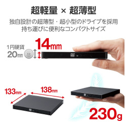 国内最軽量、最小クラスのコンパクト設計のUSB3.2(Gen1)ポータブルDVDドライブ、ブラックモデル。●規格/USB3.2(Gen1)●外寸法/138×133×14mm(本体のみ,突起部を除く)●ケーブル長/約55cm●ポート数/1●方式/トレー方式●セット内容/DVDドライブ×1、USBケーブル×2、ソフトウェアライセンスシート×1、ソフトクーポンコード×1●カラー/ブラック●質量/230g (本体のみ)●対応OS/Windowsパソコン、Macシリーズ ※Mac用ソフトは付属しておりません。●対応機種/Windowsパソコン、Mac※Mac用ソフトは付属しておりません。●インターフェース/USB3.2(Gen1)-USB2.0●転送速度/-●読み出し速度/-●コネクタ形状/USB MicroB●パスワード機能/-●暗号化機能/-●セキュリティ機能/-●電源/-●付属品/USBケーブル×2、ライセンスシート×1、ソフトクーポンコード×1●M品番/LDR-PWA8U3CVBK●機能/再生・編集・書き込み●仕様/-●保証期間/1年間●生産国/ベトナム●単位/1個