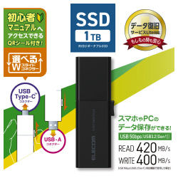 スマホの中の写真や動画も、挿すだけでかんたん保存!大量の写真や動画、ゲームソフトを保存できる外付けポータブルSSDです。●種別/外付けSSD●寸法/幅約68mm×奥行約22mm×高さ約8mm●外寸法/幅約68mm×奥行約22mm×高さ約8mm●質量/約12g(本体)●容量/1TB●インターフェース/USB 5Gbps(USB3.2(Gen1))●書込/最大400MB/s●読込/最大420MB/s ※当社環境での測定値 ※USB 5Gbps(USB3.2(Gen1))でご使用になるには、機器側がUSB 5Gbps(USB3.2(Gen1))に対応している必要があります。●機能/外付けポータブルSSD●電源/USBバスパワー●カラー/ブラック●付属品/QRシール●保証期間/1年間●対応OS/Windows 11/10、macOS 15/14/13、iOS 18/17、iPadOS 18/17/16、Android 14/13/12、PlayStation4/4 Pro/PlayStation5●単位/1個