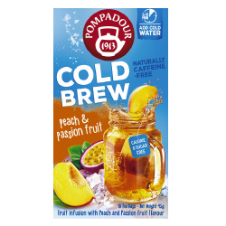 ほんのり甘いピーチの香りとパッションフルーツの爽やかな酸味の水出しハーブティー。●ブランド/POMPADOUR●種別/ハーブティー●容量/45g●ティーバッグ内容量/2.5g●仕様/ティーバッグ●特徴/ノンカフェインの水出しハーブテ●水色/黄色●サイズ/D79mm×W69mm×H12●抽出量/250ml●抽出方法/水出し5分●包装形態/袋●ティーバッグ形状/テトラ●カロリー/5kcal●生産国/ドイツ●賞味期限/商品発送時点で、賞味期限まで残●単位/1箱(18P入)