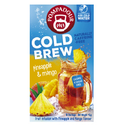 南国を思わせるパイナップルの香りとマンゴーのジューシーな甘さの水出しハーブティー。●ブランド/POMPADOUR●種別/ハーブティー●容量/45g●ティーバッグ内容量/2.5g●仕様/ティーバッグ●特徴/ノンカフェインの水出しハーブテ●水色/赤色●サイズ/D79mm×W69mm×H12●抽出量/250ml●抽出方法/水出し5分●包装形態/袋●ティーバッグ形状/テトラ●カロリー/5kcal●生産国/ドイツ●賞味期限/商品発送時点で、賞味期限まで残●単位/1箱(18P入)