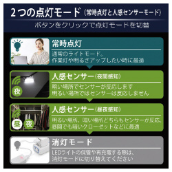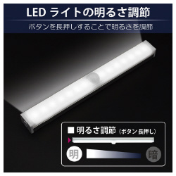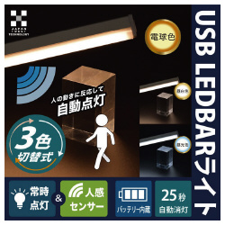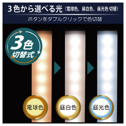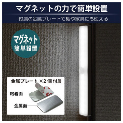 常時点灯&人感センサー、調色、調光機能、バッテリー搭載のLEDBARライト3色切替モデル。マグネット式で場所を選ばず設置●光色/電球色・昼白色・昼光色(相当)切替●寸法/約30×2.3×1.8cm●質量/約78g●仕様/常時点灯&人感センサー、調色、調光機能、バッテリー搭載、マグネット内蔵●入力電源/USB 5V/1A●人感センサー/最大3から5m、120度●自動消灯/約25秒●バッテリー/約600mAh●充電時間/約1.5から2時間●連続点灯時間/約3.5時間●付属品/USBケーブル、金属プレート×2、取扱説明書●単位/1個