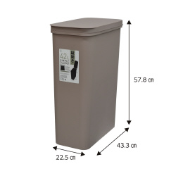 縦長でスリムなデザインでコンパクトで置く場所を選びません。シンプルなカラーとデザインでお部屋の雰囲気に馴染みやすい。ニオイ漏れしにくい、フタ付き仕様。●寸法/W225xD440xH580mm●材質/ポリプロピレン●種別/フタ縦開き●容量/42L●カラー/グレージュ●単位/1個