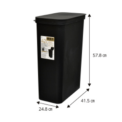 縦長でスリムなデザインでコンパクトで置く場所を選びません。シンプルなカラーとデザインでお部屋の雰囲気に馴染みやすい。ニオイ漏れしにくい、フタ付き仕様。●寸法/W415xD250xH580mm●材質/ポリプロピレン●種別/フタ横開き●容量/42L●カラー/ブラック●単位/1個