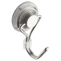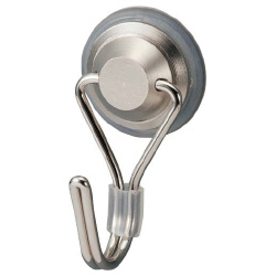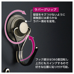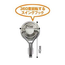 取付面のキズを防ぐラバー付きの金属製マグネットフック。フック部分はスイング&360度回転式で天井にも取り付け可能。●可動角度/可動角度180度(フック部分)●回転角度/可動回転360度●材質/本体:スチール・エラストマー、フック部:スチール●機能/壁面接触部にラバーグリップ使用●耐荷重/約3kg(水平方向は約2kg)●カラー/シルバー●外寸法/横24×フック込全体高さ46×フック込全体奥行25mm(ラバーグリップの直径24mm)●フック寸法/先端部幅4.5×奥行25mm、開口部の最大寸法17mm●単位/1セット(10個入)