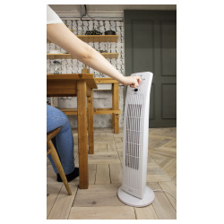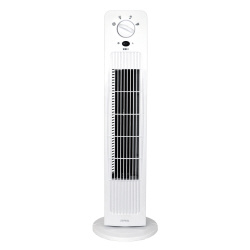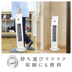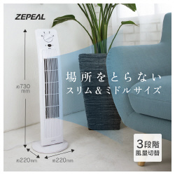 首振り操作が出来るタワーファン●寸法/W140×D130×H730mm台座Φ220mm●材質/PP●質量/2.2kg●風量切替/3段階(強・中・弱)●/消費電力/(50Hz/60Hz)21W/23W●首振り/〇●単位/1台