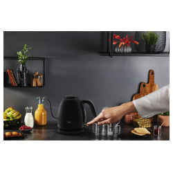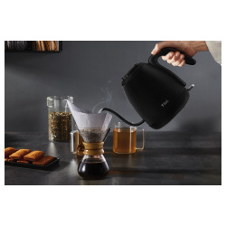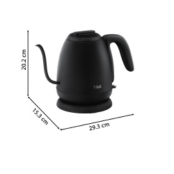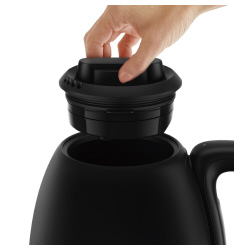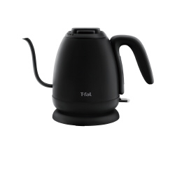 狙ったところに注げる、倒れてもお湯がこぼれにくいドリップケトル。※給湯ロックボタン式ではありません。●寸法/W294×D152×H204mm●電源コード長さ/1.3m●質量/960g●容量/800ml●種別/カフェケトル●消費電力/1250W●湯沸かし時間/最低水量(300mL):2分02秒/満水:4分36秒●カラー/ブラック●保証期間/1年間●単位/1個
