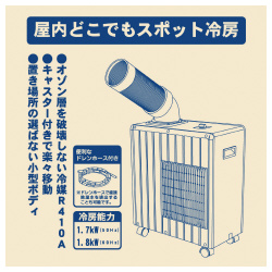 工事不要のスポットエアコン。置き場所を選ばない小型ボディでもパワフル冷風を送り出す。好きな角度に風向を変えられるフレキシブルダクト。キャスター付きで移動も簡単。●寸法/約幅465×奥行270×高さ570mm●コード長さ/約2.0m●運転音/59dBA●付属品/冷風ダクト用エルボ×1、ワンタッチ装着リング×1、冷風ダクト×1、ドレンホース(1.5m)×1●保証期間/本体1年間●冷房能力/1.7・1.8kW(50・60Hz)●消費電力/600・740W(50・60Hz)●重量/約21kg●環境条件/25℃-45℃●電源/AC100V(50・60Hz)●容量/ドレンタンク容量:3L●冷媒/HFCR410A(GWP値:2090)封入量:335g●生産国/中国●単位/1台