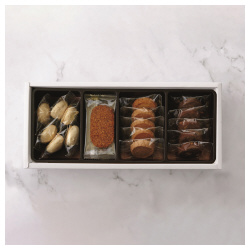 バターの香り豊かに、香ばしく焼き上げたクッキーです。●パッケージ寸法/120×295×52mm●セット内容/4種20個(ココナッツ4個、チョコレート5個、マカロン6個、イチジク5個)●商品重量/250g●単位/1箱(20個入)