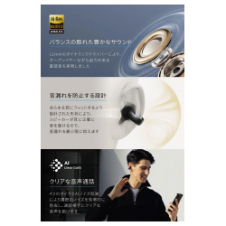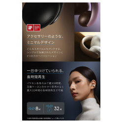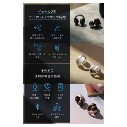 片耳約5.9gの小型軽量設計と、人間工学に基づく曲線デザインでストレスフリーなつけ心地を実現。●寸法/約28×25×21mm(イヤホン本体片耳)●通信規格/Bluetooth5.4●質量/約5.9g(イヤホン本体片耳)/約51.6g(充電ケース含む)●通信距離/15m●付属品/充電ケース、イヤーカフキャップ(2サイズ)、USB-C&USB-Aケーブル●仕様/充電時間:最大2時間、再生可能時間:最大8時間(イヤホン本体のみ)/最大32時間(充電ケース使用時)●保証期間/18ヶ月●カラー/ミッドナイトブラック●単位/1台