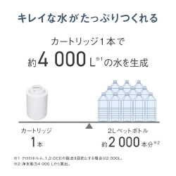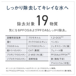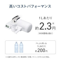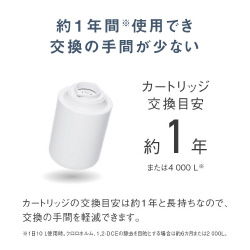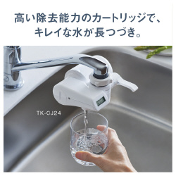 高い除去能力のカートリッジで、キレイな水が長つづき。<長寿命>約1年間使用でき交換の手間が少ない。<高除去>気になる19物質を除去。カートリッジ残量表示の液晶つきで、交換目安がわかる。●寸法/高さ7.5×幅13.5×奥行12cm●質量/約350g(約490g)●ろ材/不織布・活性炭・セラミック・中空糸膜●ろ過流量/1.8L/分(水圧100kPaの時)●仕様/カートリッジ交換液晶表示●カートリッジ交換目安/約1年(1日10L使用時)※クロロホルム・1,2-DCE除去を目的とする場合は6か月●ろ過できる物質数(除去対象物質)/19物質●本体使用水温/浄水側:35℃未満(原水/シャワー:80℃未満)●本体付属カートリッジ/TK-CJ24C1●単位/1台