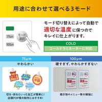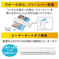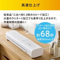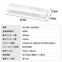 場所を取らないコンパクト設計です。A3サイズ1枚あたりのラミネート時間はわずか68秒で素早く仕上がるので、作業時間の短縮になります。75ミクロンフィルム・コールドラミネートフィルムに対応可能です。●質量/約1570g●保証期間/1年間●カラー/ホワイト●最大ラミネート幅/320mm●外寸法/約幅431×奥行119×高さ75mm●定格消費電力/550W●待機時間/約2分30秒(季節、室温によって数分前後します) ●最大ラミネート厚み※1/0.5mm●ラミネート速度/0.3m/分(50Hz)、0.36m/分(60Hz)●温度設定/3段階 ●使用可能フィルム厚/75ミクロン・100ミクロン●コードの長さ/約1.2m●単位/1台