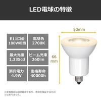 ムラの少ないキレイなスポット光 平均演色評価数Ra92●口金/E11●配光角/35度●光色/電球色●寸法/50×66mm●定格寿命/40,000時間●定格消費電力/4.9W●相関色温度/2700K●平均演色評価数/Ra:92●重量/37g●定格入力電圧/100V●全光束/450lm●ビーム光束/260lm●エネルギー消費効率/91.8lm/W●最大光度/1,335cd●単位/1個
