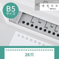 ルーズリーフがつくれるパンチ。スライダーをスライドするだけでB5サイズ26穴に素早く対応。スライド時は26本のロット刃が順番に穴をあけます。ロット刃が1本ずつ用紙に穴をあけるため軽い力で操作できます。●寸法/幅465×奥行85×高さ96mm●穴径/5.5mm●穴間隔/9.5mm●穴奥行/6.35mm(穴の中心から紙の端部まで)●材質/金属、プラスチック●質量/1.4kg●穴数/26穴●穴開け枚数/5枚●仕様/バインダーノート用●対応サイズ/B5サイズ26穴●単位/1個