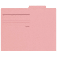 ●個別フォルダー●規格:A4ーE●色:ピンク●材質:ファイルカード紙●外形寸法:縦240X横311mm●見出し部分:15mm●坪量:300g/平方m●ファスナー用の切れ目があります●マチ用の折り目が7/6/6mm間隔で3本入っています(最大マチ幅19mm)●入数:10枚